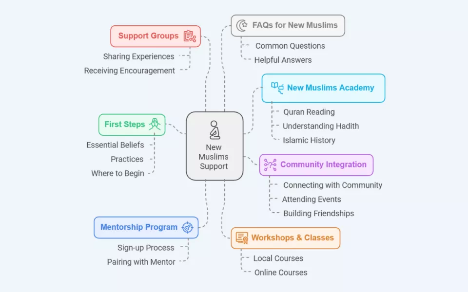 - Access to groups where new Muslims can share experiences and receive encouragement.